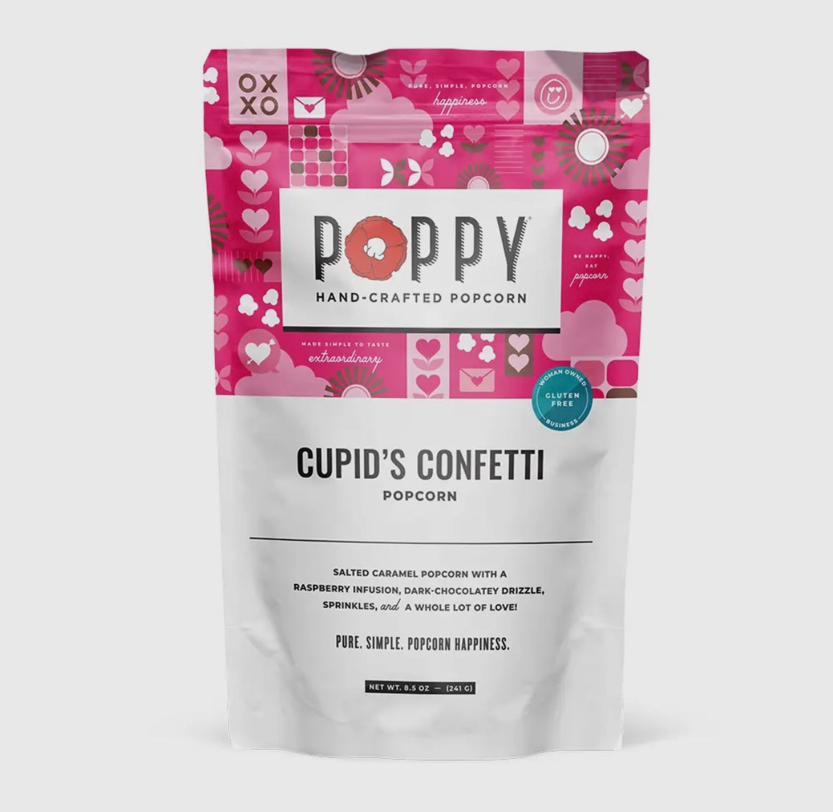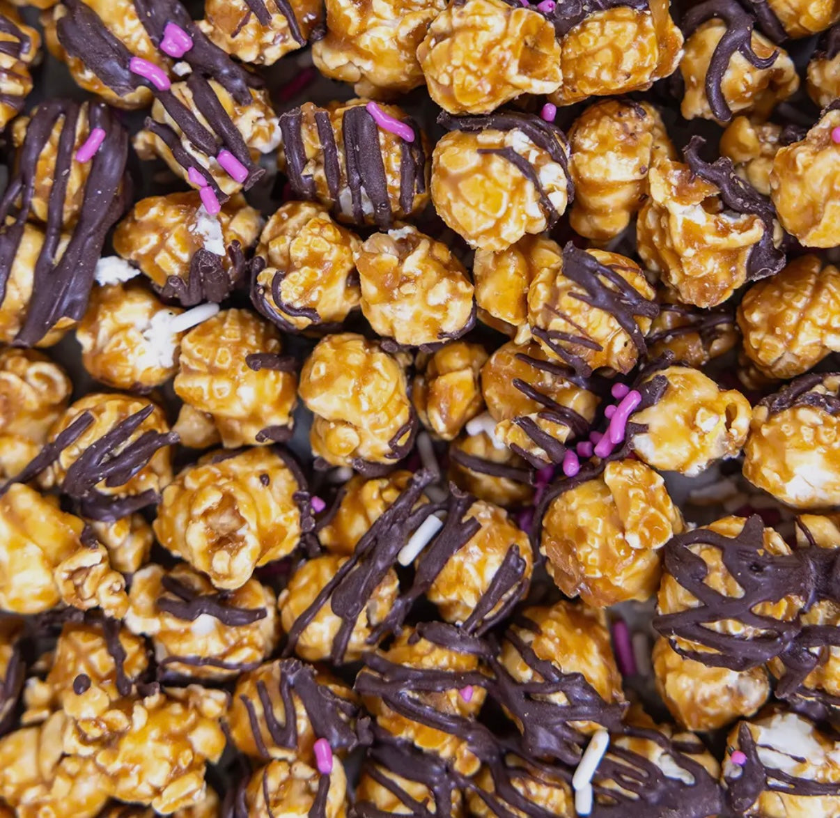Salted Caramel popcorn with raspberry, dark chocolatey drizzle, and colorful confetti sprinkles for a fun Valentine’s twist.