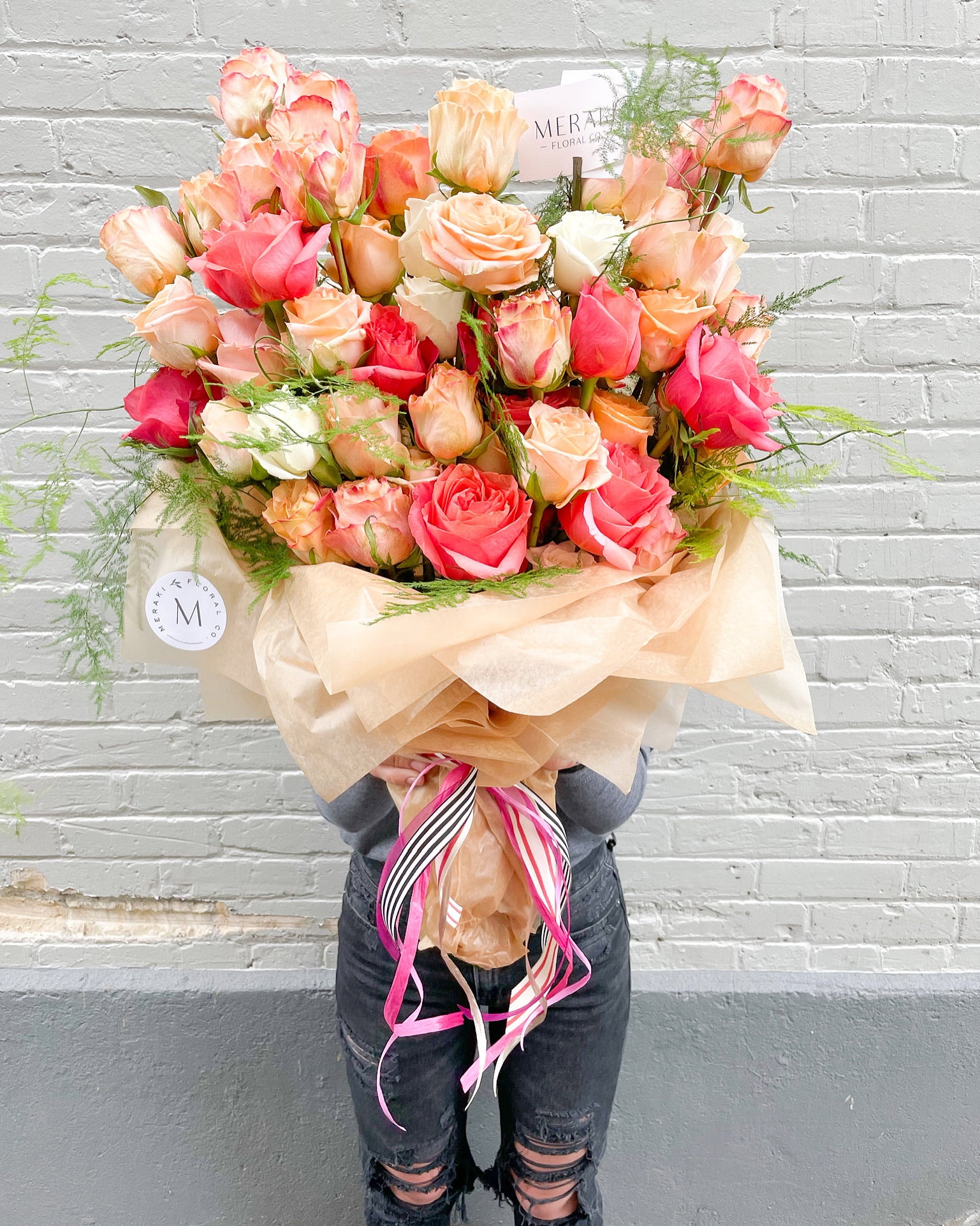 FOUR dozen of our favorite roses, its one to remember! Deep reds or vibrant peachy pinks and lush greens with accenting flowers for a little touch of Meraki.